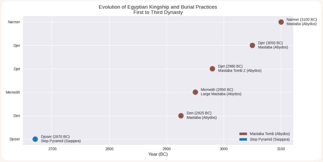 Narmer (c. 3100 BC): Unified Egypt, buried at Abydos in a mastaba-like tomb.