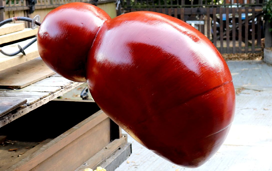 In this picture you can see the tail of the giant robot hexapod that I call Anthony, after we coated it with polyester filler and sanded it down. Polyester filler is very hard to work with due to it being very quick setting so we had to work very fast to be able to get it to this standard. We modified the formula of this paste so that we could apply it very quickly with a brush, and it was much more flexible than normal polyester pastes, it is rubbery in texture. See painted tail directly below and the laminating and surface preparations below that.